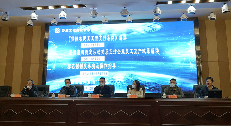 2020年4月2日19點30分,公司在9樓多功能會議廳舉辦“《保障農(nóng)民工工資支付條例》及相關(guān)法律法規(guī)”的培訓,培訓邀請婁底市勞動監(jiān)察局局長曾憲君、副局長楊明、監(jiān)察一科科長宋耀平、監(jiān)察二科科長王小橋等領(lǐng)導蒞臨現(xiàn)場指導和授課。公司總經(jīng)理胡勁、總工程師彭洪偉、副總經(jīng)理顏克靈、財務(wù)總監(jiān)戴文彬、機關(guān)單位各部室及所屬各項目部、楚源勞務(wù)公司等共計100余人參加此次培訓。